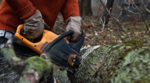 12116367 – man cuts wood with electric saw in the wood