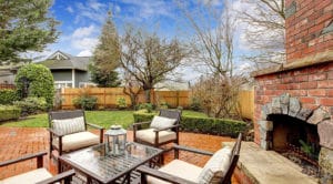 20992717 – spring fenced luxury backyard with outdoor fireplace and furniture.