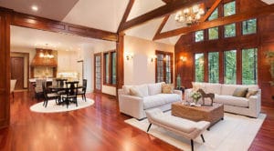 Beautiful living room with hardwood floors, fireplace and couch in new luxury home