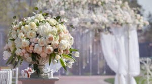 Big beautiful bouquet of roses in a vase on a background of a wedding arch. Beautiful set up for the wedding ceremony.