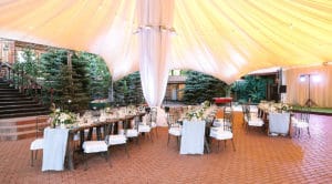 14Jun2019holidays, vacation, setting concept. there is woderful huge white tent under long served tables for celebration of birthday surrounded by always green spruces Admin 0