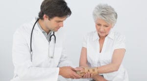 Male physiotherapist examining a senior woman’s wrist in the medical office