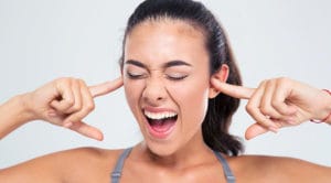 Woman covering her ears with fingers and shouting